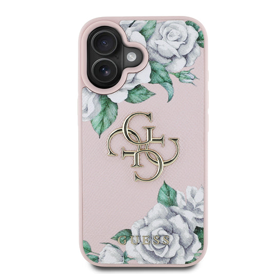 Apple iPhone 16 Kılıf Guess Orjinal Lisanslı Gül Baskılı Büyük Metal Logo Dizaynlı Kapak Pembe