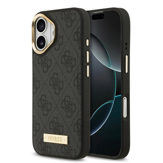 Apple iPhone 17 Kılıf Guess Orjinal Lisanslı M-safe Şarj Özellikli 4G Desenli PU Metal Plaka Klasik Logolu Kapak Siyah
