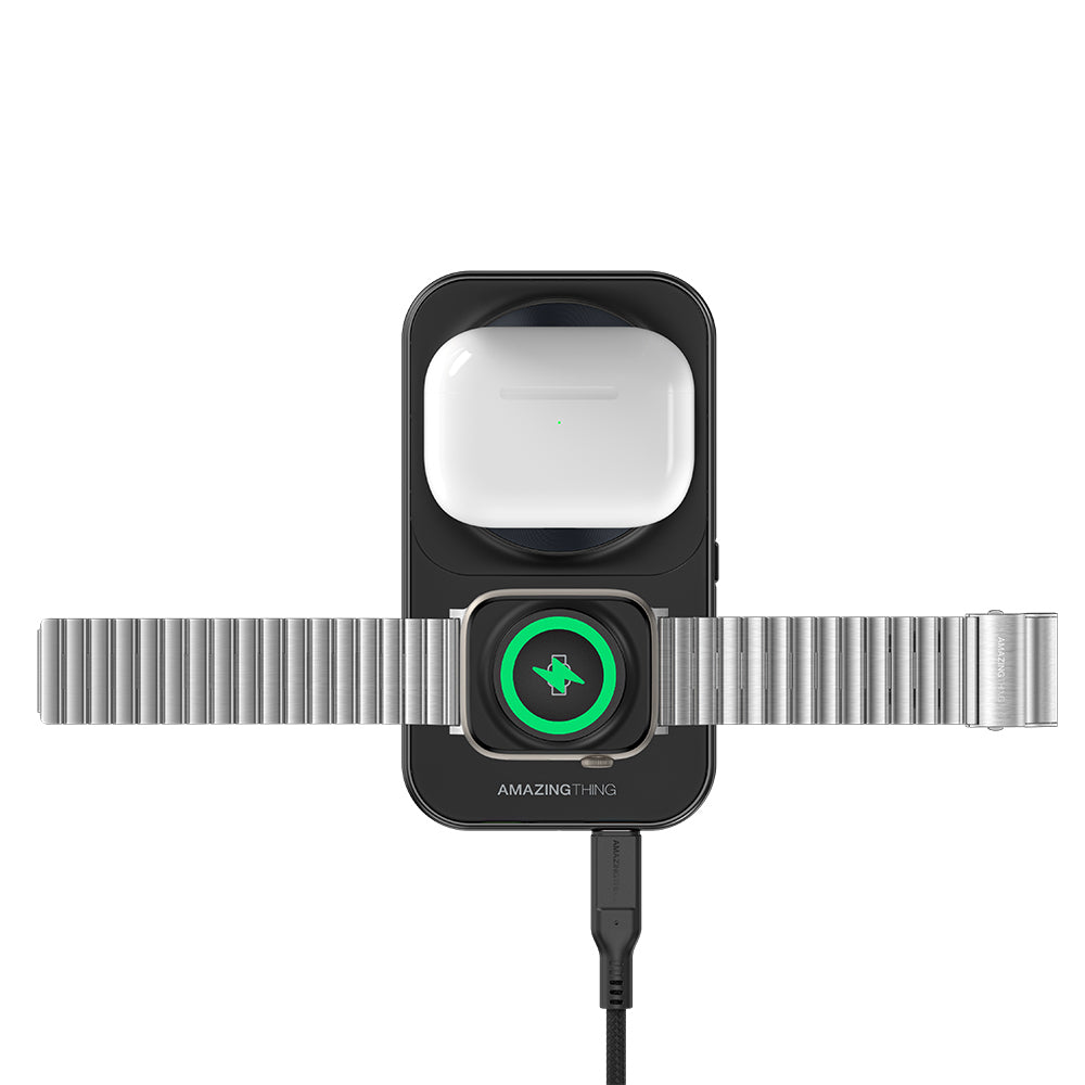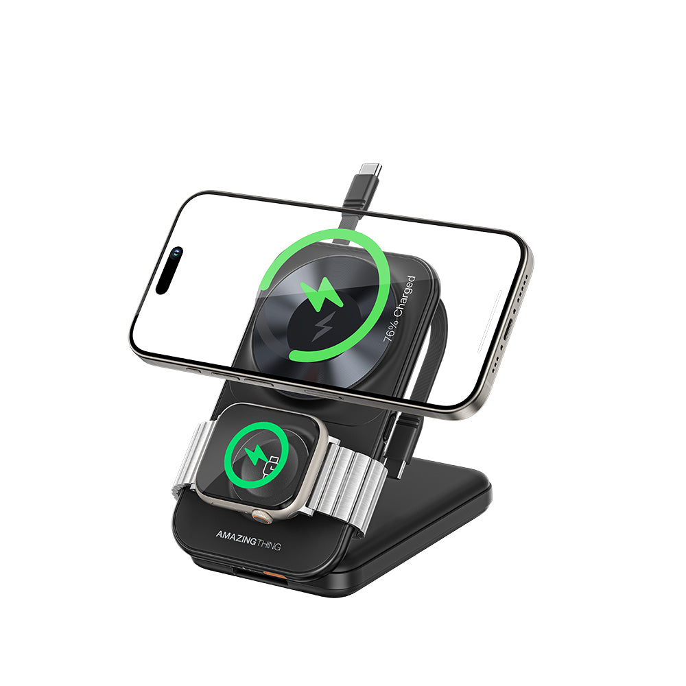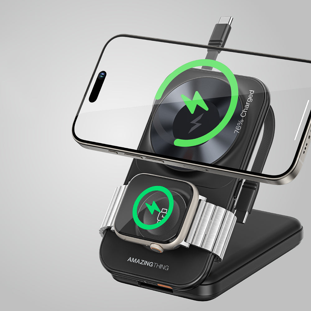 Amazingthing Thunder Pro Mag, telefonlar, kablosuz kulaklıklar ve akıllı saatler gibi cihazlar için tasarlanmış 6-in-1 şarj çözümü sunar. Kablosuz şarj, manyetik destek ve dahili kablo özellikleriyle hem masaüstü hem de mobil kullanım için idealdir. Bu cihaz, günlük şarj ihtiyaçlarınızı karşılamak için tasarlanmıştır.