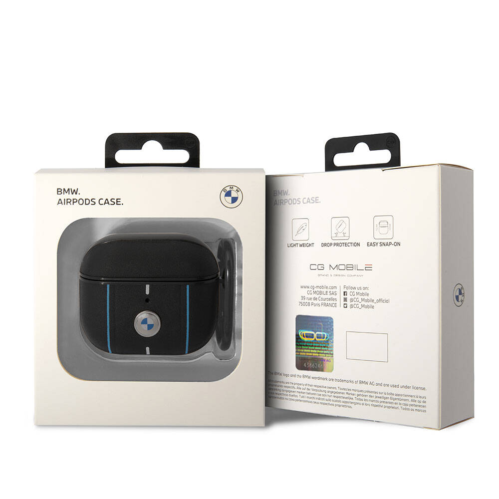 Airpods 3.Nesil Kılıf BMW Orjinal Lisanslı PU Deri Mavi Beyaz Çizgili Metal Logolu Kılıf Siyah