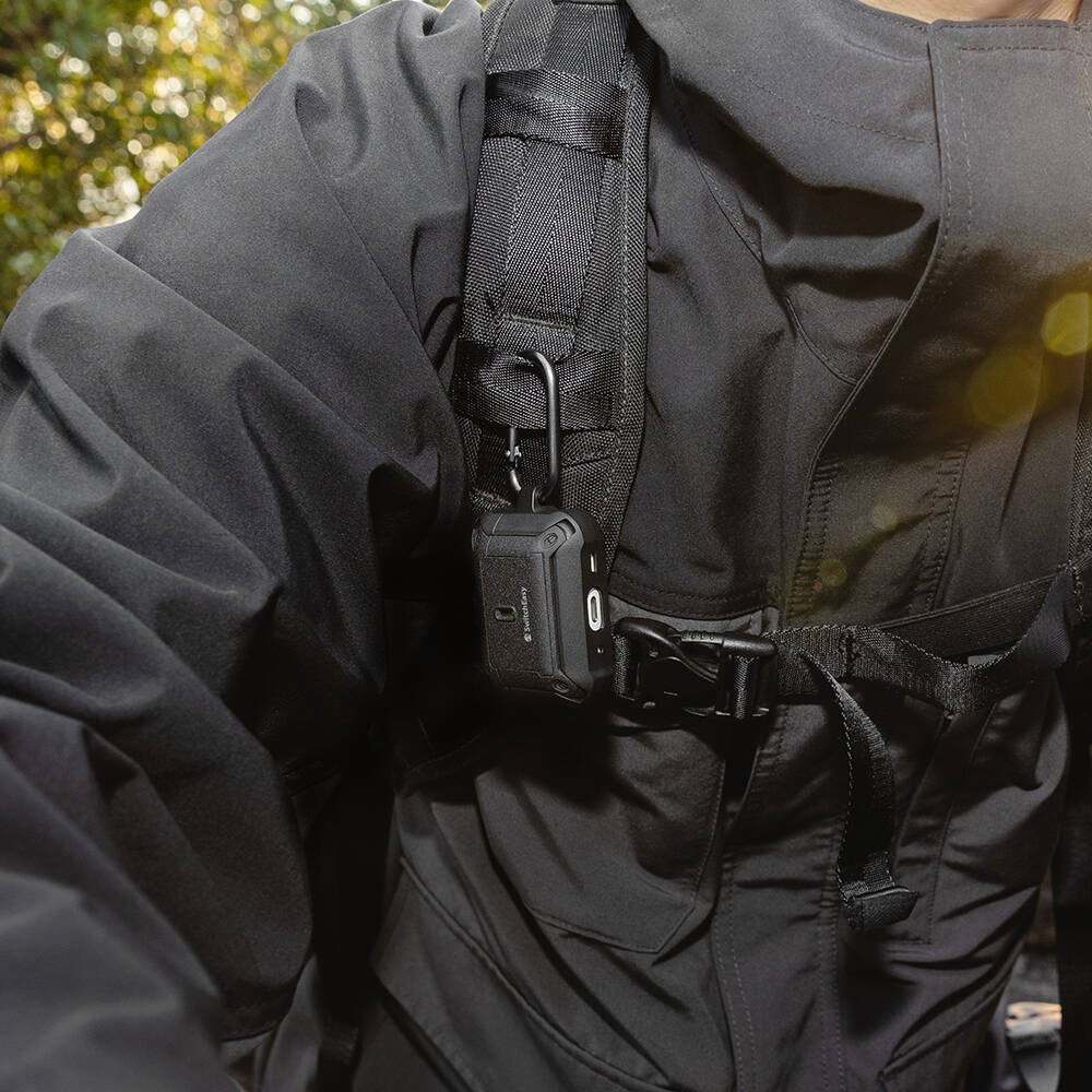 Üst kapağı kolayca açıp kilitleyebileceğiniz bu tasarım, kapağın her zaman güvenle kapalı kalmasını ve düşmesini önler. Taşınabilir metal karabina, AirPods Pro'nuzu her yere rahatça taşımanıza olanak tanır, bu sayede günlük maceralarınızda müziğinizden asla ayrı kalmazsınız.