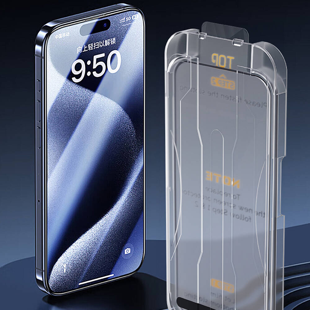 iPhone 15 Wiwu SQ-008 Oleofobik Easy Install Darbeye Karşı Dayanıklı Temperli Cam Ekran Koruyucu + Kolay Uygulama Aparatlı