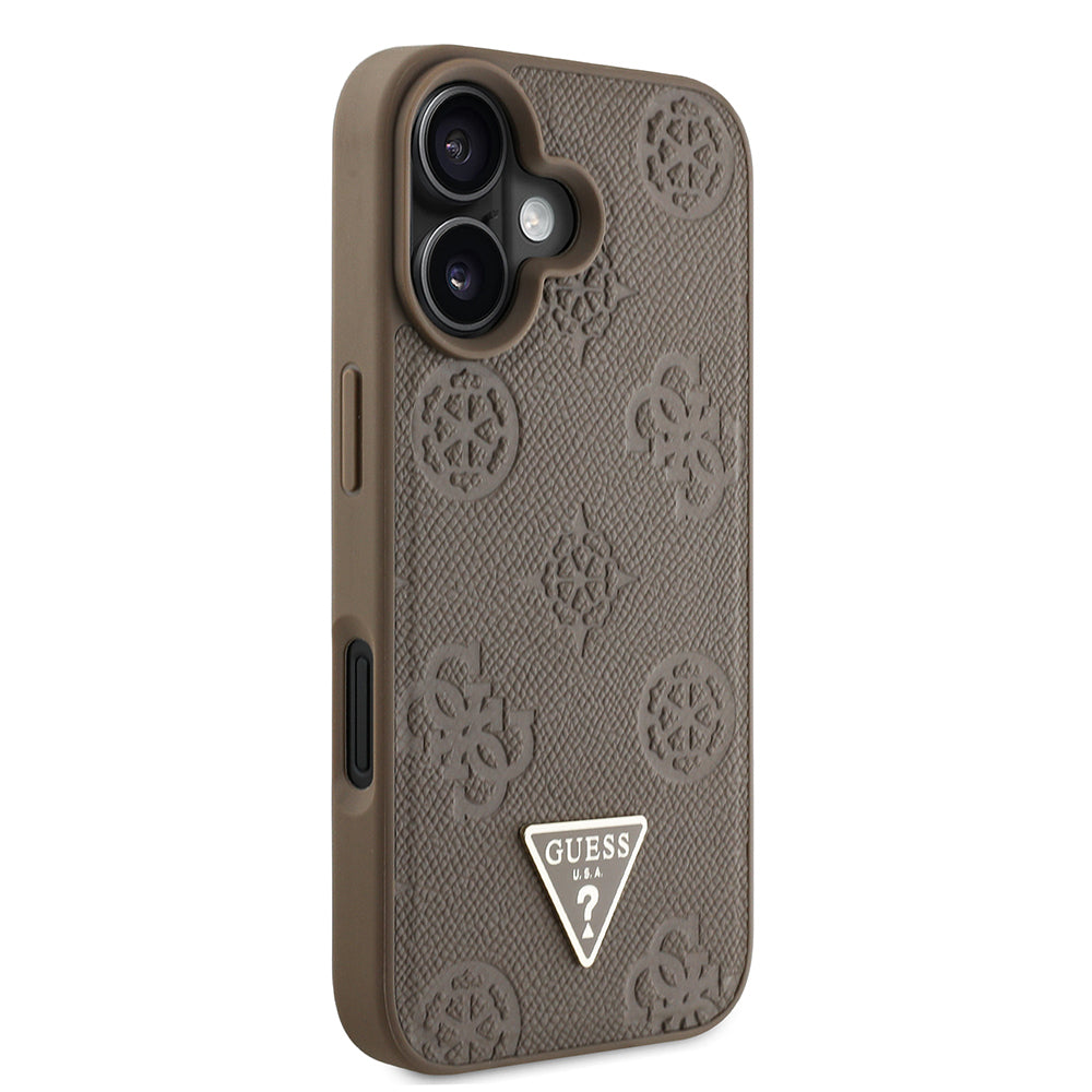 Apple iPhone 16 Kılıf Guess Orjinal Lisanslı M-safe Şarj Özellikli Sıcak Baskılı Üçgen Logolu PU Deri Peony Kapak Kahverengi