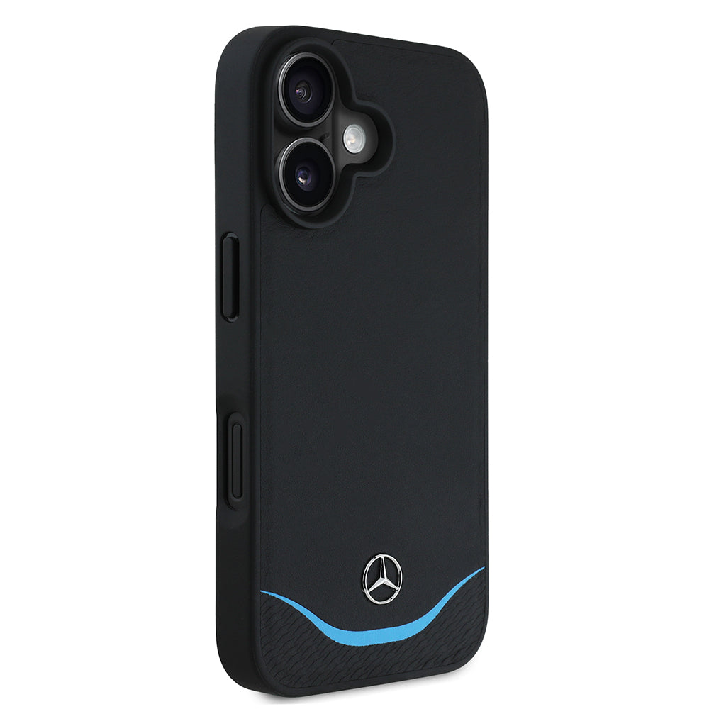 Apple iPhone 16 Kılıf Mercedes Benz Orjinal Lisanslı M-safe Şarj Özellikli 3D Metal Logolu Mavi Yatay Eğri Çizgili Deri Kapak Siyah