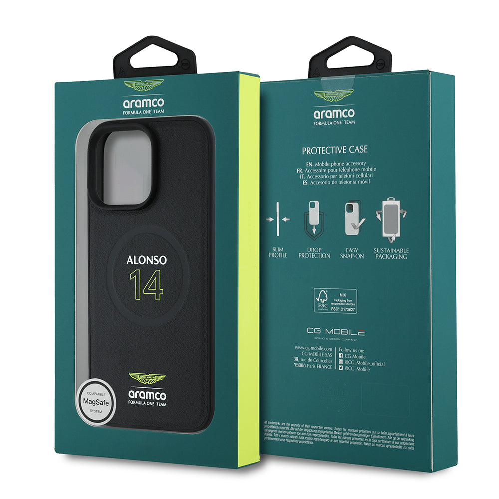 Apple iPhone 16 Pro Kılıf Aston Martin Orjinal Lisanslı M-safe Şarj Özellikli PU Deri Alonso 14 Baskılı Kapak Siyah