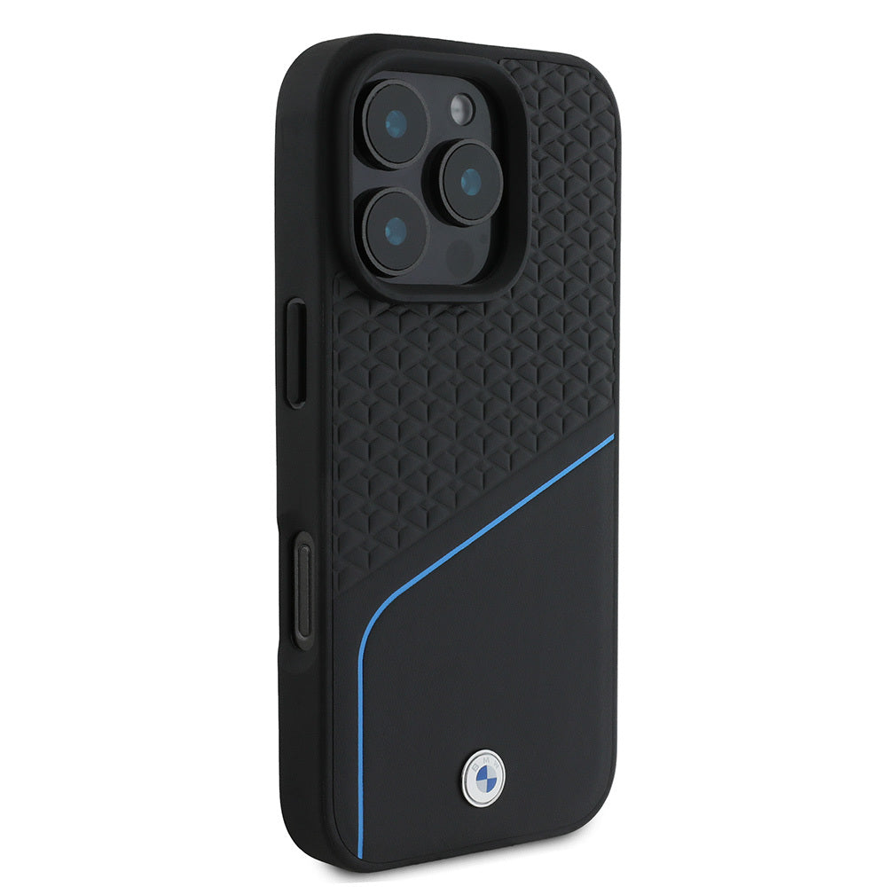 iPhone 16 Pro Kılıf BMW Orjinal Lisanslı Magsafe Şarj Özellikli Metal Logolu Dokulu ve Çizgili Deri Kapak