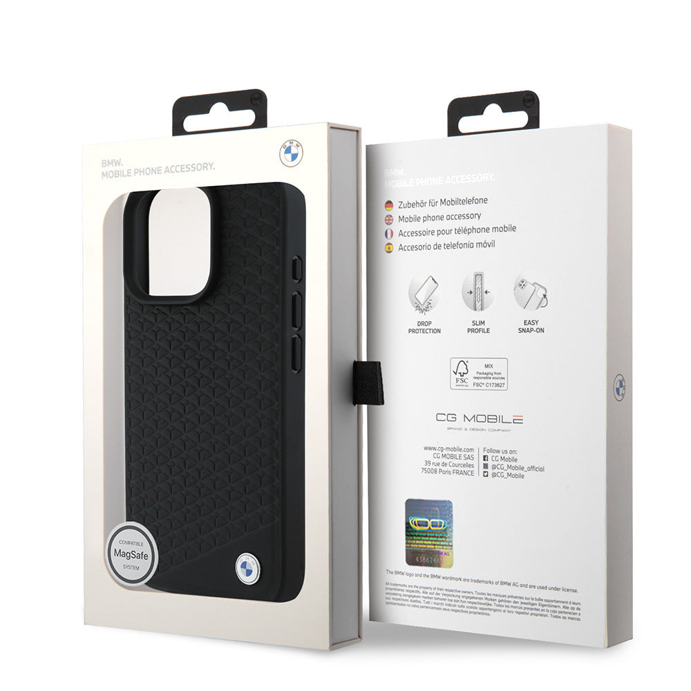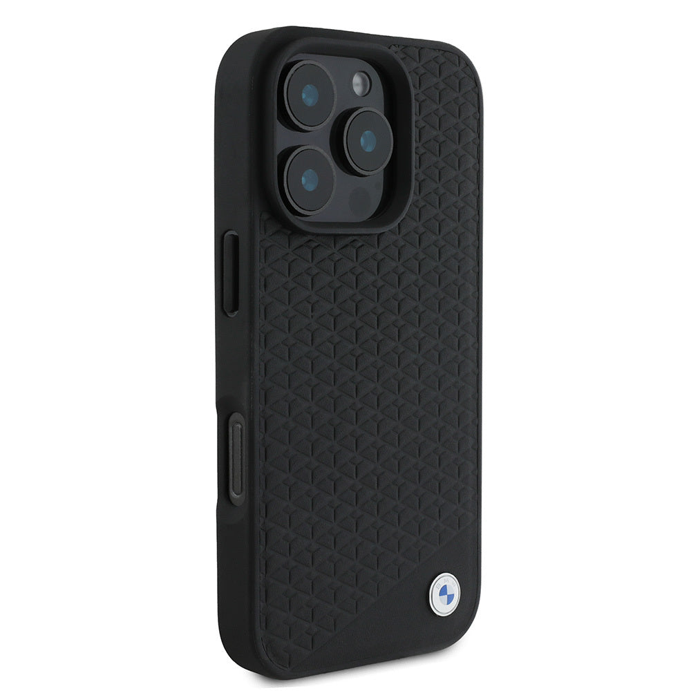 iPhone 16 Pro Max Kılıf BMW Orjinal Lisanslı Magsafe Şarj Özellikli Metal Logolu Dokulu Diamond Deri Kılıf Siyah