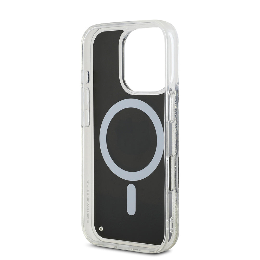iPhone 16 Pro Max Kılıf Hello Kitty Orjinal Lisanslı Magsafe Şarj Özellikli IML Baskı Kitty Head Logolu Sıvılı Simli Altın Ateşi Kılıf Siyah