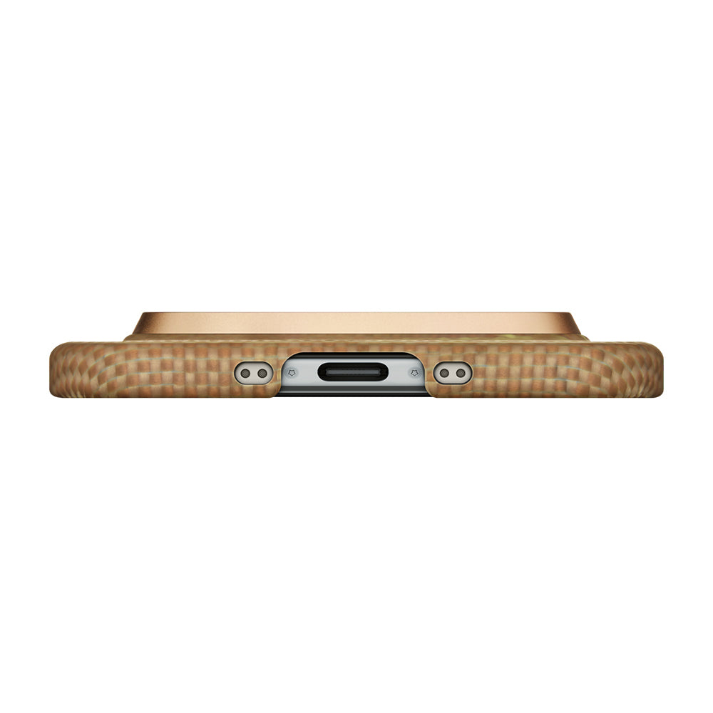 Fusion Weave LightRipple desenine sahip Glints of Gold tasarım, her dokunuşta kalite hissini artıran özel bir doku sunar. Bu etkileyici desen, cihazınıza sade ancak çarpıcı bir şıklık kazandırır. İnce işlenmiş aramid fiber yüzey, hem kaymaz bir tutuş sağlar hem de uzun süre dayanıklı kalır. Dışarı çıktığınızda elinizde premium bir aksesuar taşıyormuş hissi yaratır; masaya bıraktığınız anda bile zarif görünümü ile dikkat çeker.