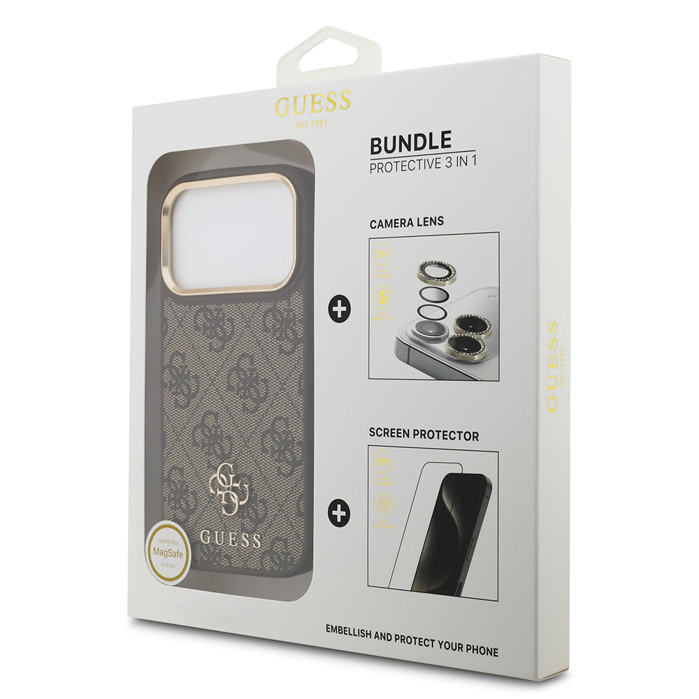 Apple iPhone 17 Pro Guess Orjinal Lisanslı 4G ve Yazı Logolu Kılıf + Ekran Koruyucu + Lens Koruyucu 3in1 Aksesuar Seti Kahverengi