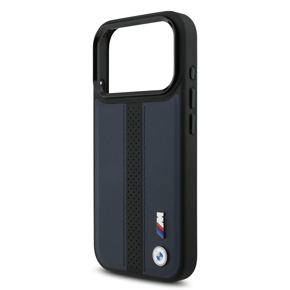 Apple iPhone 17 Pro Kılıf BMW Orjinal Lisanslı M-safe Şarj Özellikli Deri Arka Yüzey Metal Logolu Delikli Şerit Tasarımlı Kapak Lacivert