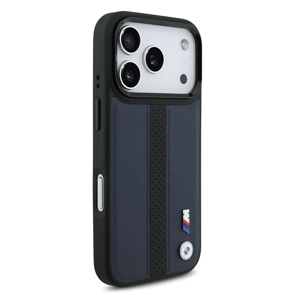 iPhone 17 Pro Kılıf BMW Orjinal Lisanslı M-safe Şarj Özellikli Deri Arka Yüzey Metal Logolu Delikli Şerit Tasarımlı Kapak