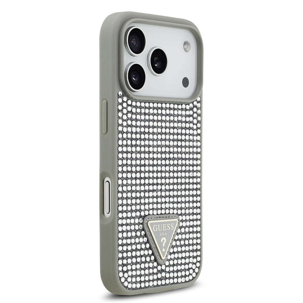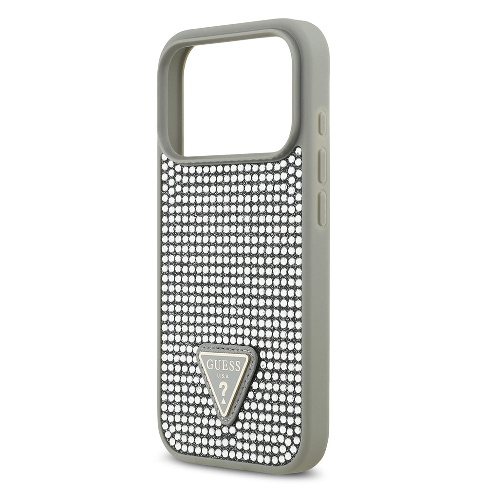 Apple iPhone 17 Pro Kılıf Guess Orjinal Lisanslı Taşlı Arka Yüzey Üçgen Logolu Kapak Gümüş