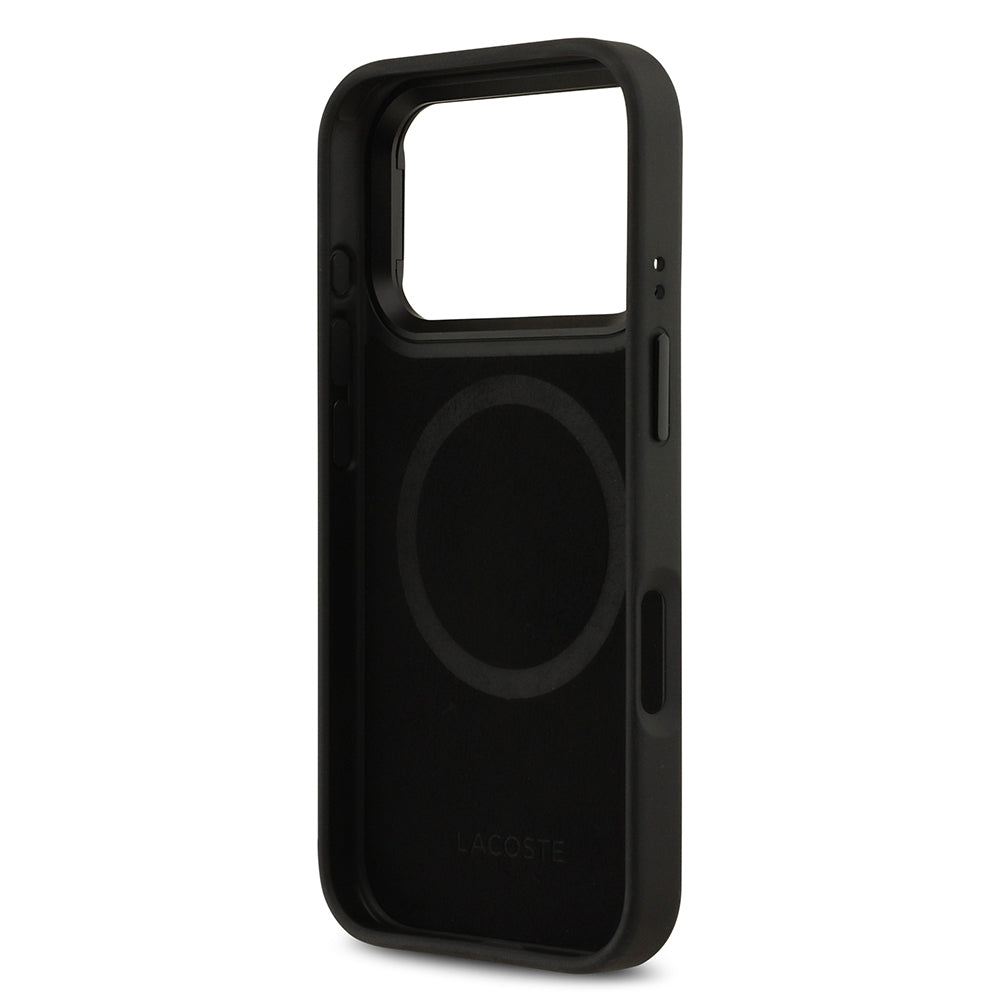 Apple iPhone 17 Pro Kılıf Lacoste Orjinal Lisanslı M-safe Şarj Özellikli Standlı PU Deri Karışık Monogram Desenli Kapak Siyah