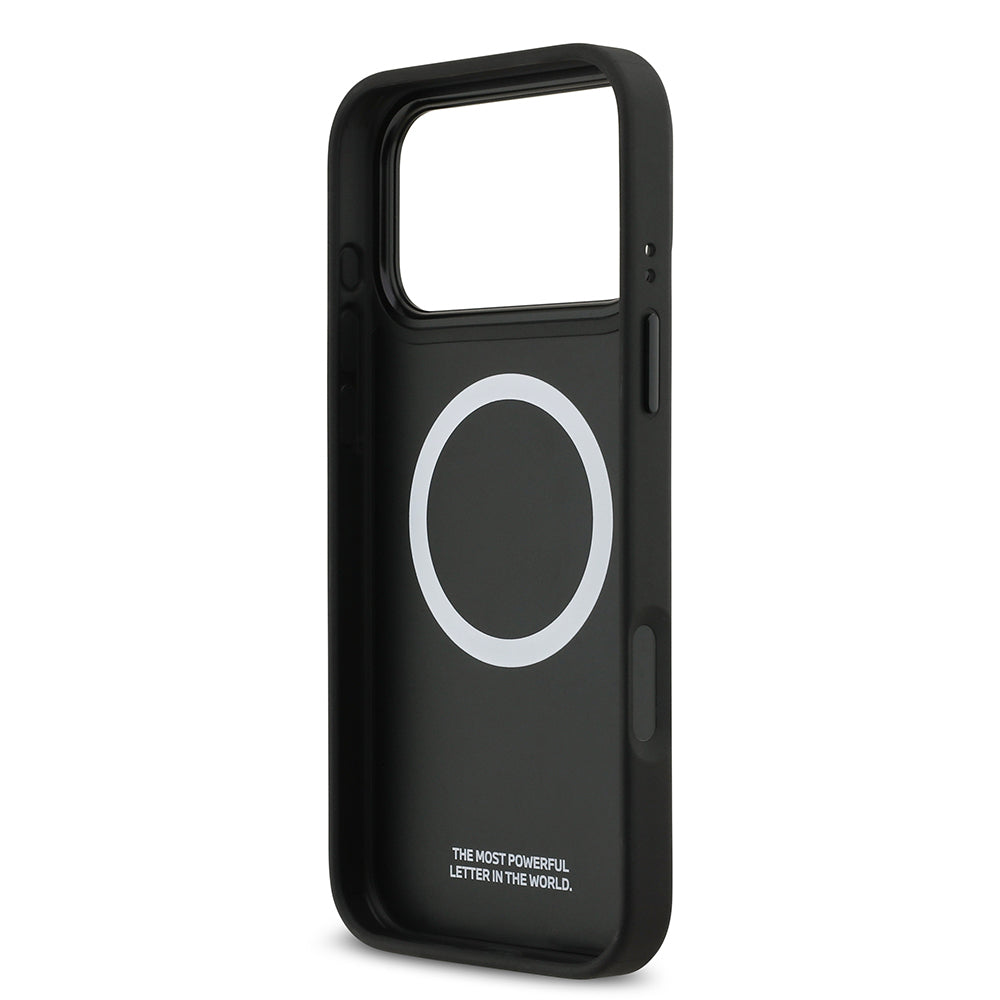 Apple iPhone 17 Pro Max Kılıf BMW Orjinal Lisanslı M-safe Şarj Özellikli M Logolu Üç Şeritli Delikli Deri Kapak Siyah
