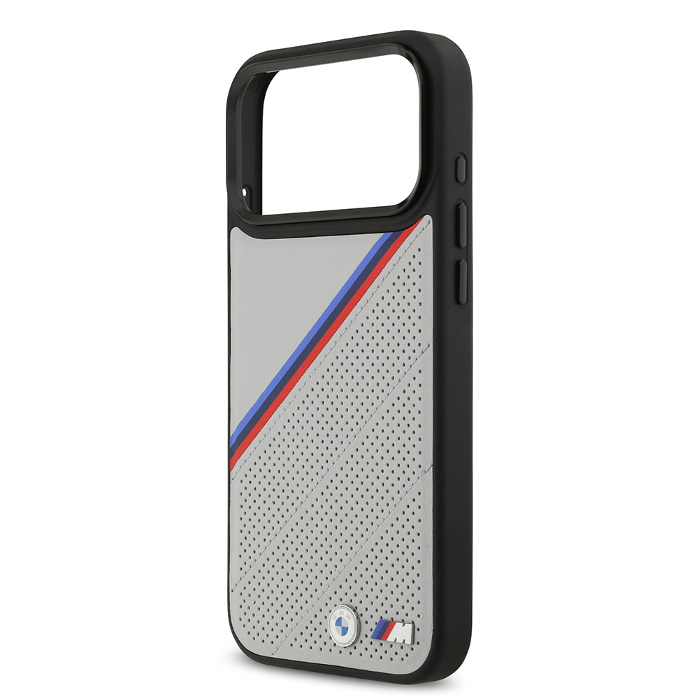 Apple iPhone 17 Pro Max Kılıf BMW Orjinal Lisanslı M-safe Şarj Özellikli M Logolu Üç Şeritli Delikli Deri Kapak Gri
