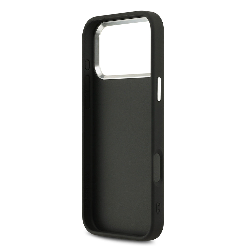 Apple iPhone 17 Pro Max Kılıf Guess Orjinal Lisanslı Gümüş Metal Kamera Çerçeveli 4G Desenli Metal Büyük 4G ve Yazı Logolu Kapak Siyah