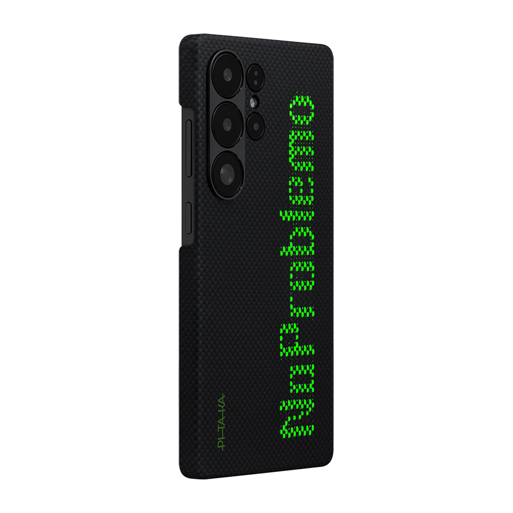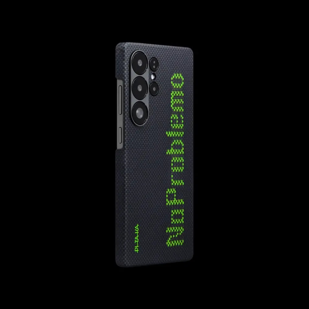 Galaxy S25 Ultra Kılıf M-safe Şarj Özellikli Lumintex Teknolojili Fosforlu Aramid Fiber Pitaka Tactile Woven Aries Serisi Kapak Siyah-Yeşil