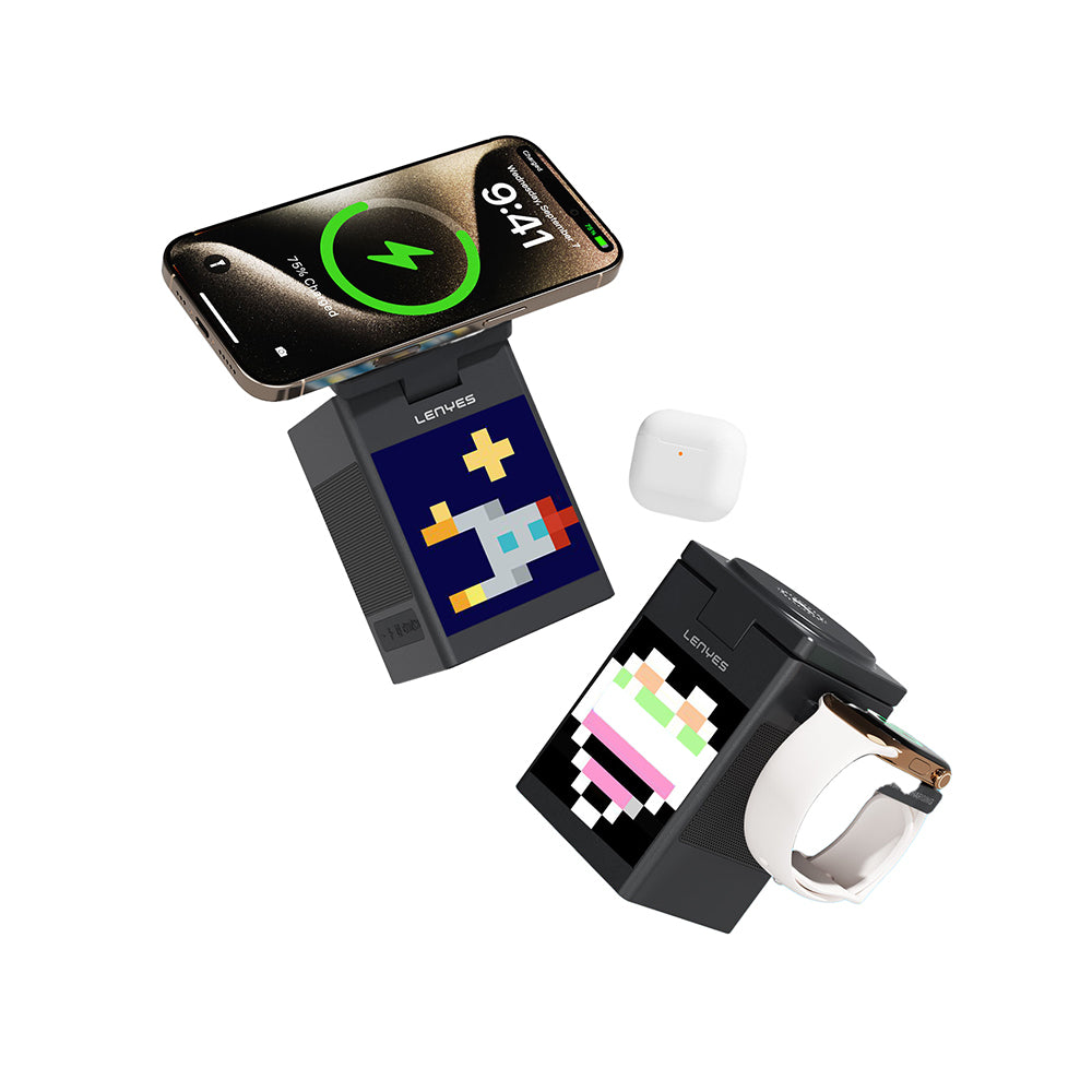 Android ve iOS cihazlarla uyumlu Qi2 sertifikalı kablosuz şarj özelliği sayesinde, herhangi bir adaptör karmaşası yaşamadan şarj işlemlerinizi gerçekleştirebilirsiniz. Katlanabilir yapısı sayesinde seyahatlerde kolaylıkla çantanıza atabilir, her yerde kullanım rahatlığı sağlayabilirsiniz. Saat ve kulaklıklar için ayrılmış özel alanlar, cihazlarınızı düzenli ve güvenli şekilde şarj ederken, büyük piksel ekranıyla da teknolojiye eğlenceli bir dokunuş katıyor.