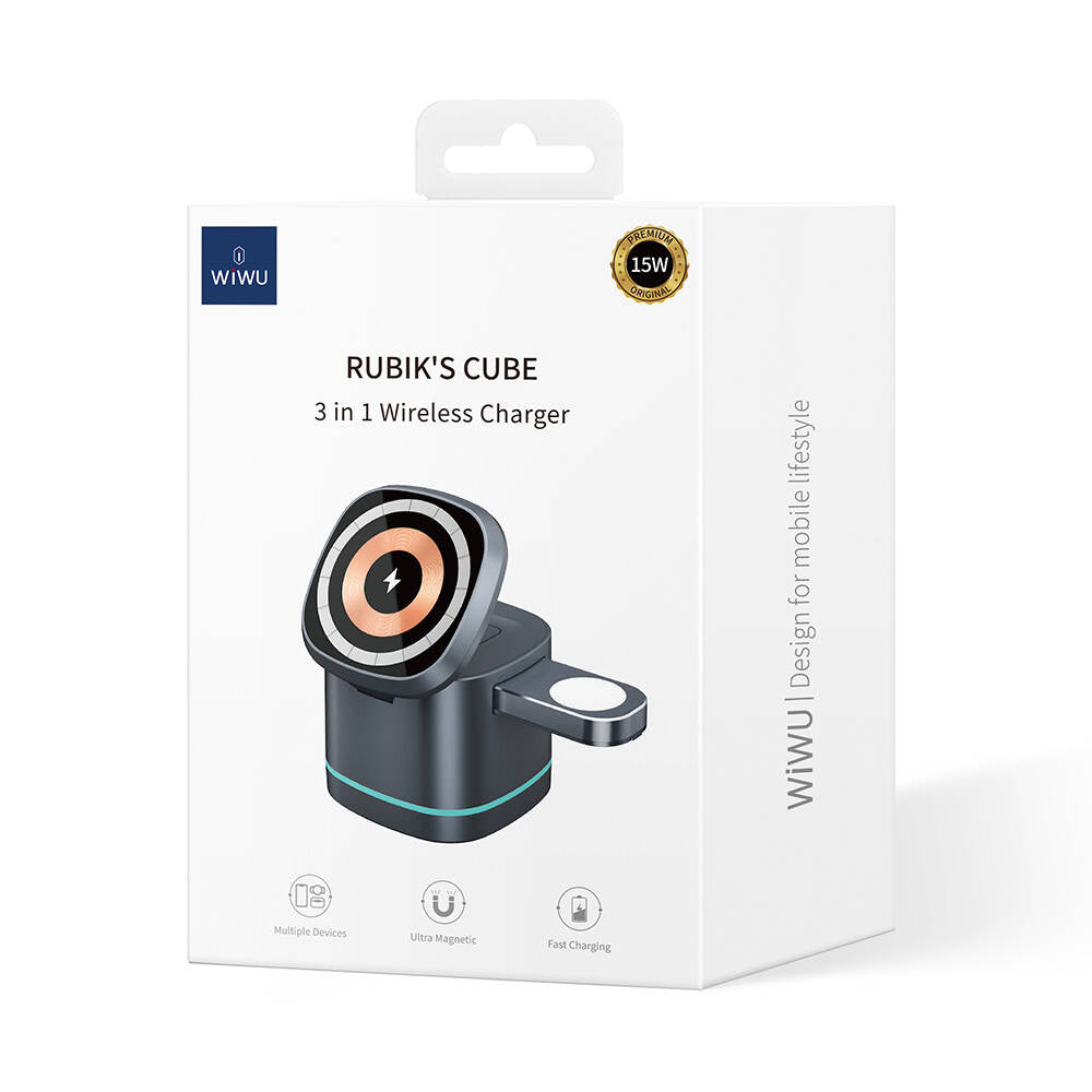 Wiwu Wi-W024 Rubik Küp Ambiyans Işıklı Telefon&Akıllı Saat&Kulaklık İçin 15W 3in1 Kablosuz Şarj Standı